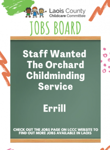 | Roles and Responsibilities The Orchard Childminding Service are looking for people who are kind, patient and caring to work in their crèches based in Errill. There are full time and part time positions available. . | An early childhood qualification is required for the job with a minimum of Fetac or QQI level 5. | Please send CV’s to rosaleenfairbrother@yahoo.ie. Or contact the office on 0505 44961 or 086 361 9759 |