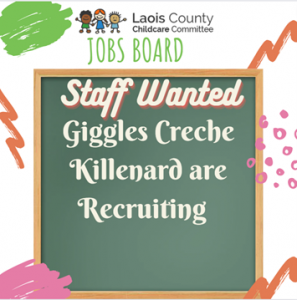 | Giggles Crèche Killenard & Portarlington are currently recruiting an Early Years Educator a minimum QQI level 5 qualification in Early Childhood Education or equivalent recognised by DCEDIY is required. | Must have a Fetac/QQI level 5 Certificate in childcare. Salary scale based on qualification level and experience. | Applications along with C.V. can be forwarded to gigglesportarlington@eircom.net Or contact Sinead/Valerie 0879016761/ 0879582088 if you have any queries |