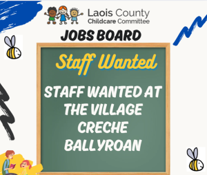 | Staff Wanted at the Village Creche in Ballyroan. Minimum Level 5 for ELC but no qualification for SAC. Experience is an advantage but not necessary. |