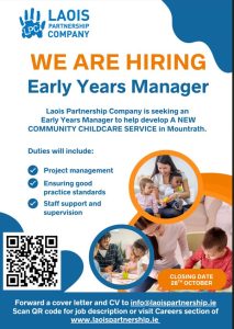 For more information please see the noticeboard page https://www.laoischildcare.ie/2021/11/09/creche-manager-wanted-sonas-mountmellick/ | The Successful candidate will have: Third level qualification in Early Childhood Care and Education. 3 years’ experience in a management/supervisory role in childcare Leadership skills Excellent interpersonal, budgeting, and IT skills Strong knowledge of childcare sector Human Resource knowledge A knowledge of Corporate Governance in the charities sector would also be an advantage Excellent written and oral communications skills A strong sense of ownership and responsibility | Interested candidates should forward their curriculum vitae and a cover letter by email only to mountmellickchildcare@eircom.net. Closing date Monday 22nd November 2021 at 5pm. |