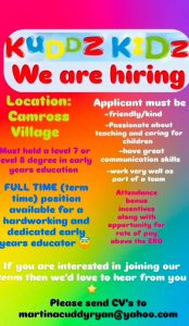 | Kuddz Kids have a position available for a part time preschool teacher. | Candidates must have a minimum level 5 qualification in early childhood education | For more information or to apply for this post please email martinacuddyryan@yahoo.com |